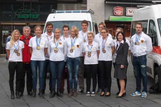 Am vergangenen Mittwoch, den 01.10.2014, wurde die erfolgreiche Mannschaft der DLRG Halle-Saalekreis, nach ihrer Rückkehr von der Weltmeisterschaft im Rettungsschwimmsport in Montpellier/Frankreich, durch zahlreiche Gäste in Empfang genommen.   Zu Ehren ihrer außerordentlichen Leistungen richtete die DLRG in Beisein von Dr. Judith Marquardt, Beigeordnete für Kultur und Sport der Stadt Halle, Ines Kramer, Vertreterin des LandesSportBund Sachsen-Anhalt e.V., Oliver Thiel, Stadtsportbund Halle (Saale), Ute Haupt, Stadträtin und Vorsitzende der Sportjugend Halle (Saale), sowie Dr. Peter Piechotta, Ehrenpräsident des DLRG Landesverbandes Sachsen-Anhalt e.V. , ein ausgelassenes Beisammensein im Diana-Restaurant der Galeria-Kaufhof aus.   Im Wettkampf ... Mehr erfahren